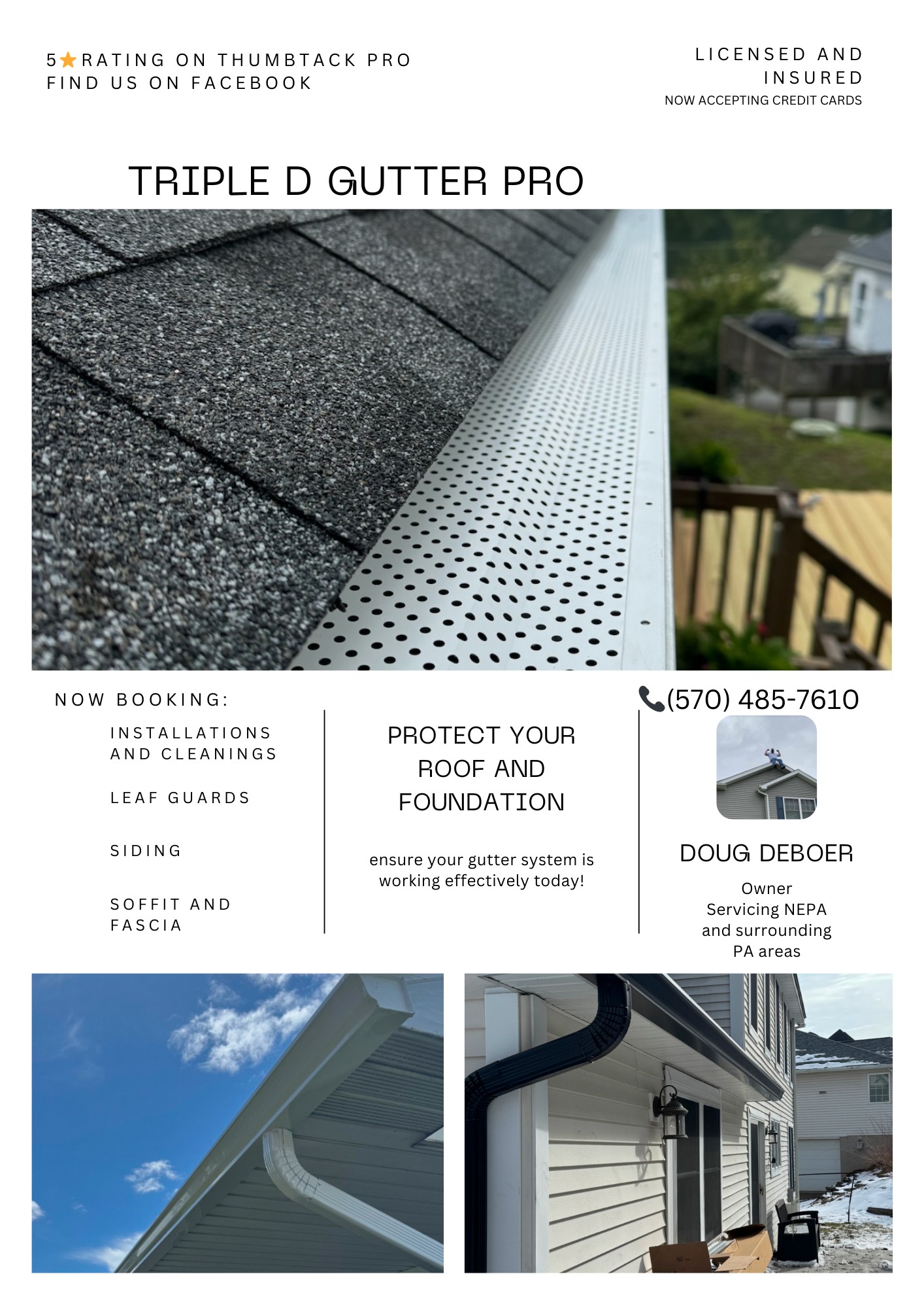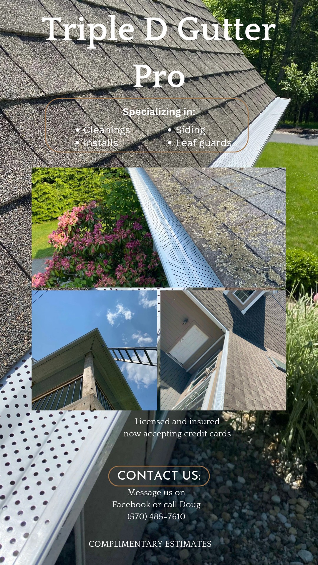 Triple D Gutter Pro installs, cleans, repairs, and protects gutters so your home stays safe from water damage — all year long. Free estimates, no obligation.