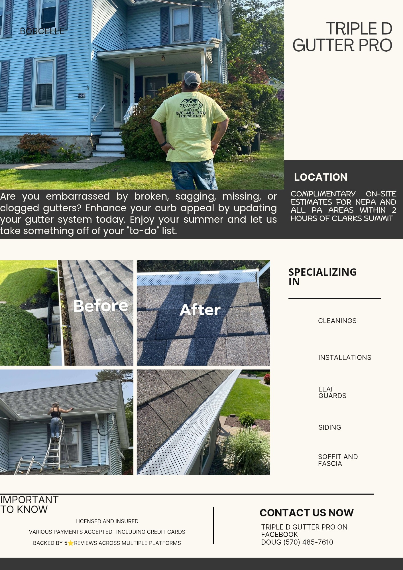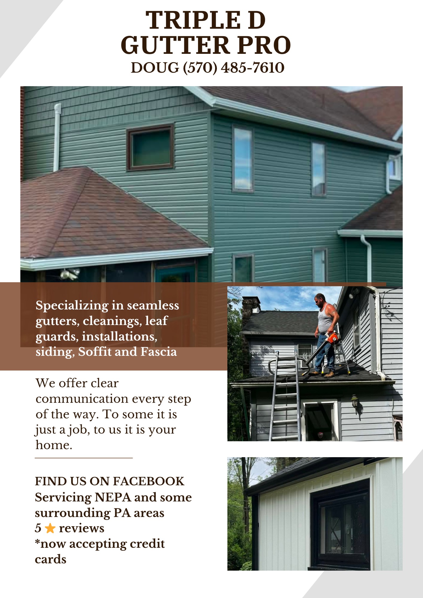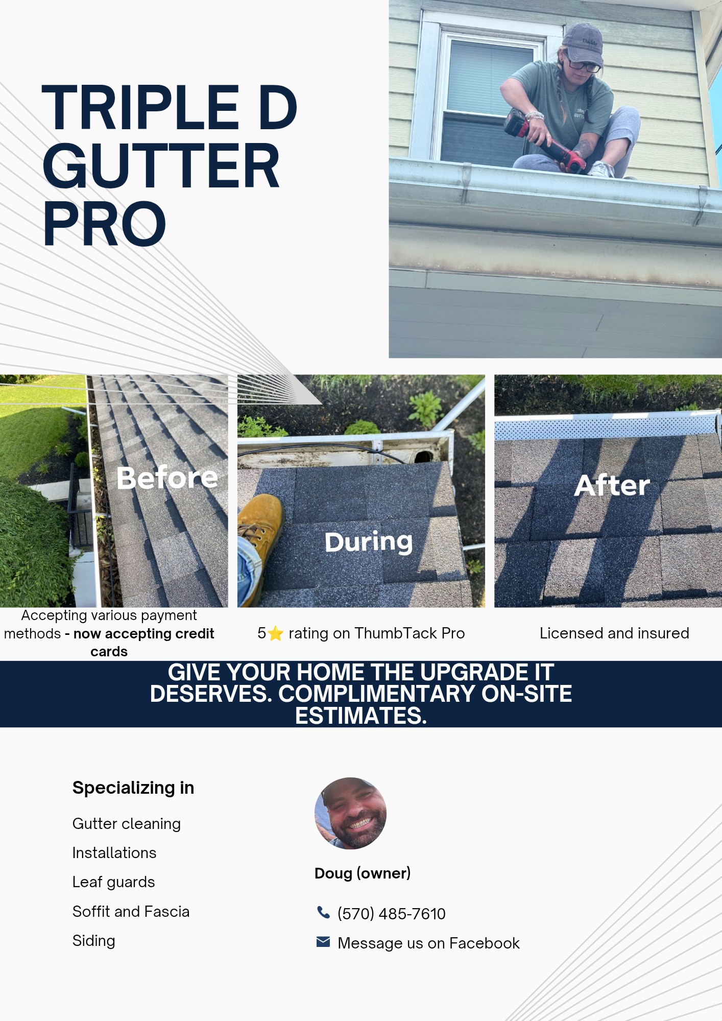 "Triple D Gutter Pro did an outstanding job on my gutters! They were on time, professional, and the price was very fair. My gutters look brand new and have been working perfectly through all the rain we've had. Highly recommend to anyone in the area!"